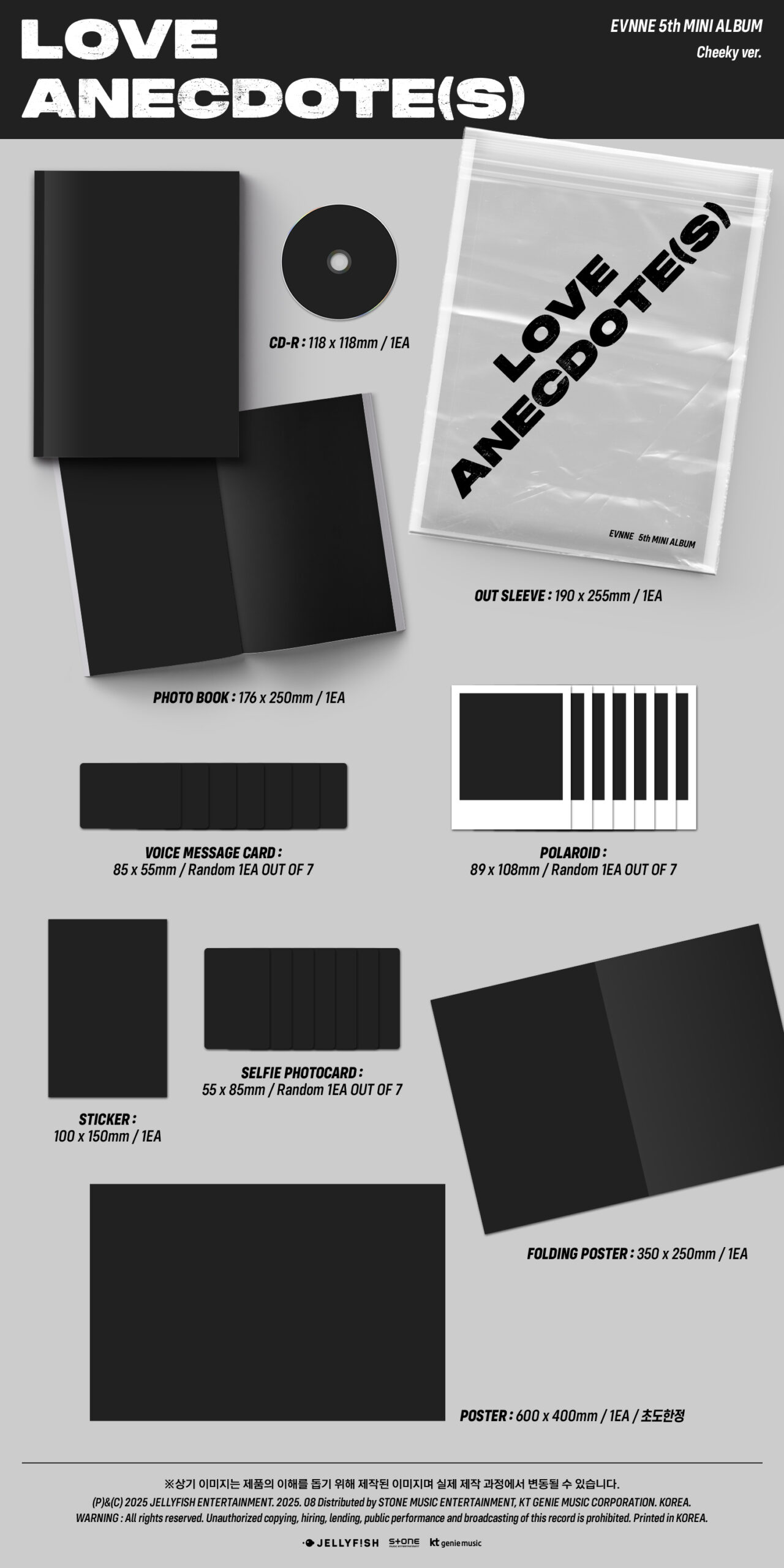 - Versión Cheeky: Out Sleeve: 190x255mm, CD, Photobook, 1 Voice Message Card random, 1 Polaroid random, Sticker, 1 Selfie Photocard random, Folding Poster