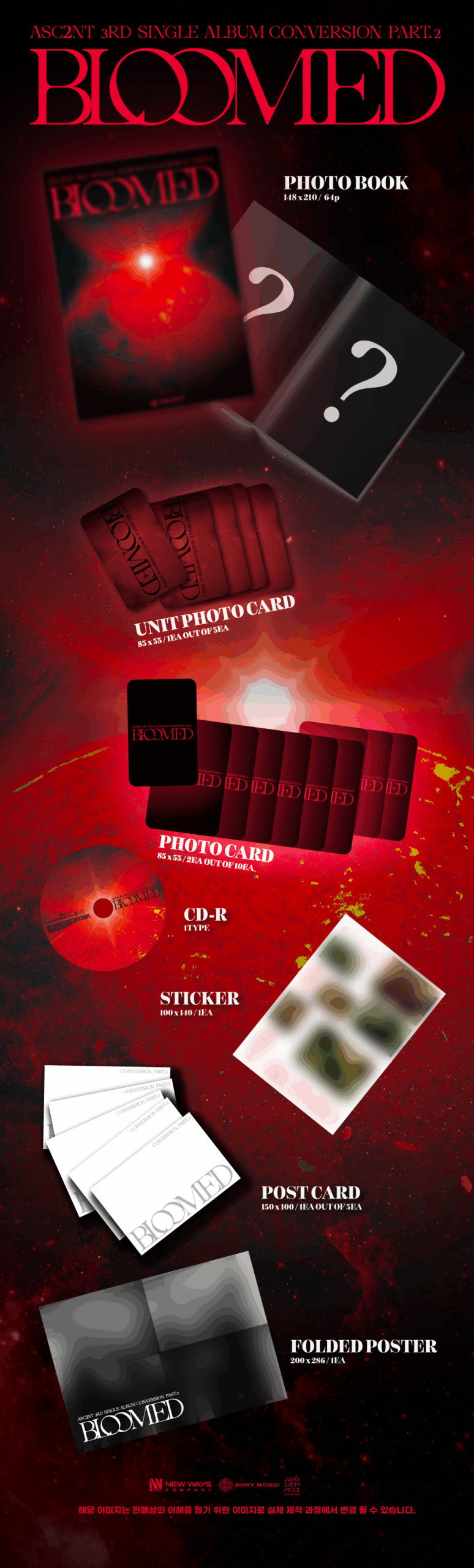- Contiene: CD, Photobook: 148x210mm / 64p, 1 Unit Photocard random, 2 Photocard random, Sticker, 1 Postcard random, Folded Poster