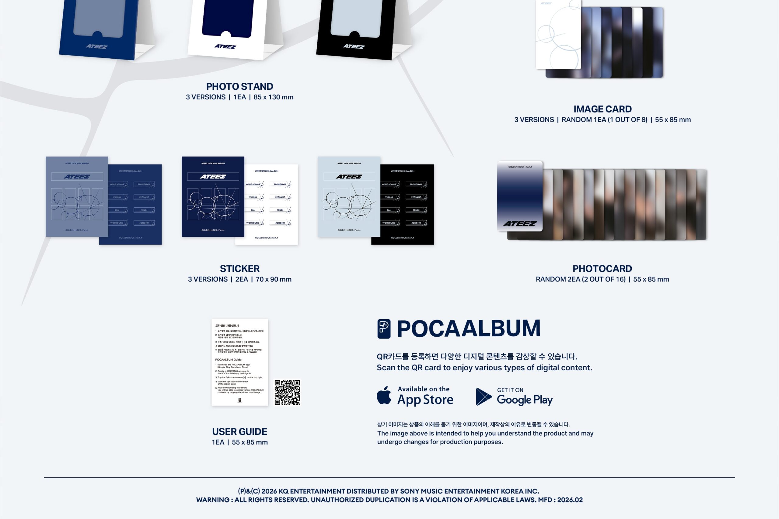 - Contiene: Envelope, Photo Stand, 1 QR Card random, Image Card, 2 Sticker, 2 Photocard random, User Guide