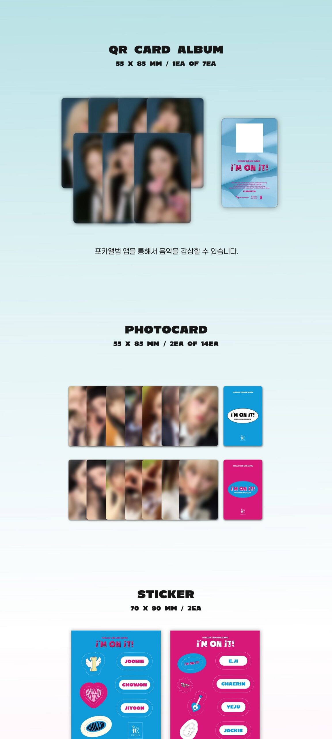 - Contiene: Photo Stand / Cover, 1 QR Card random, 2 Photocard random, 2 Sticker