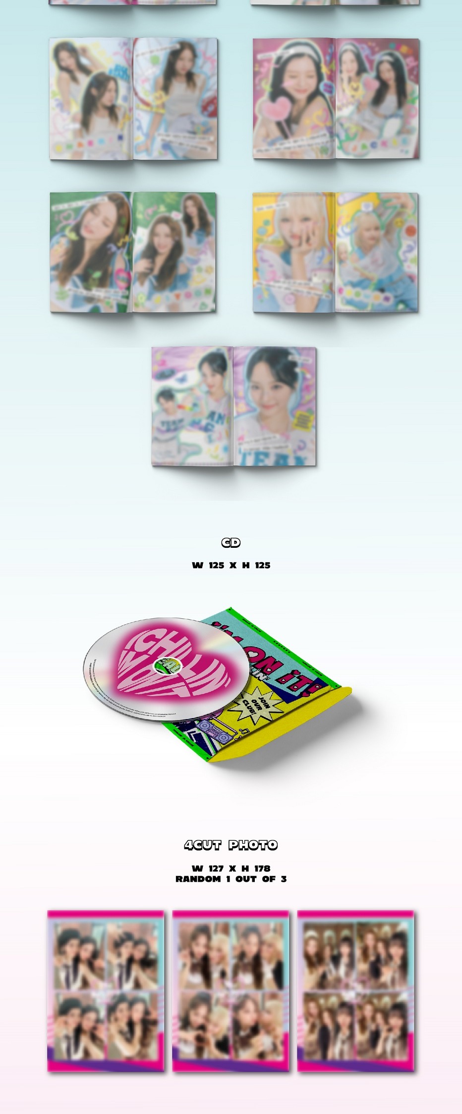 - Contiene: CD, Photobook: 64p, Sticker, 1 4Cut Photo random, 1 Student ID Card random, 1 Photocard random
