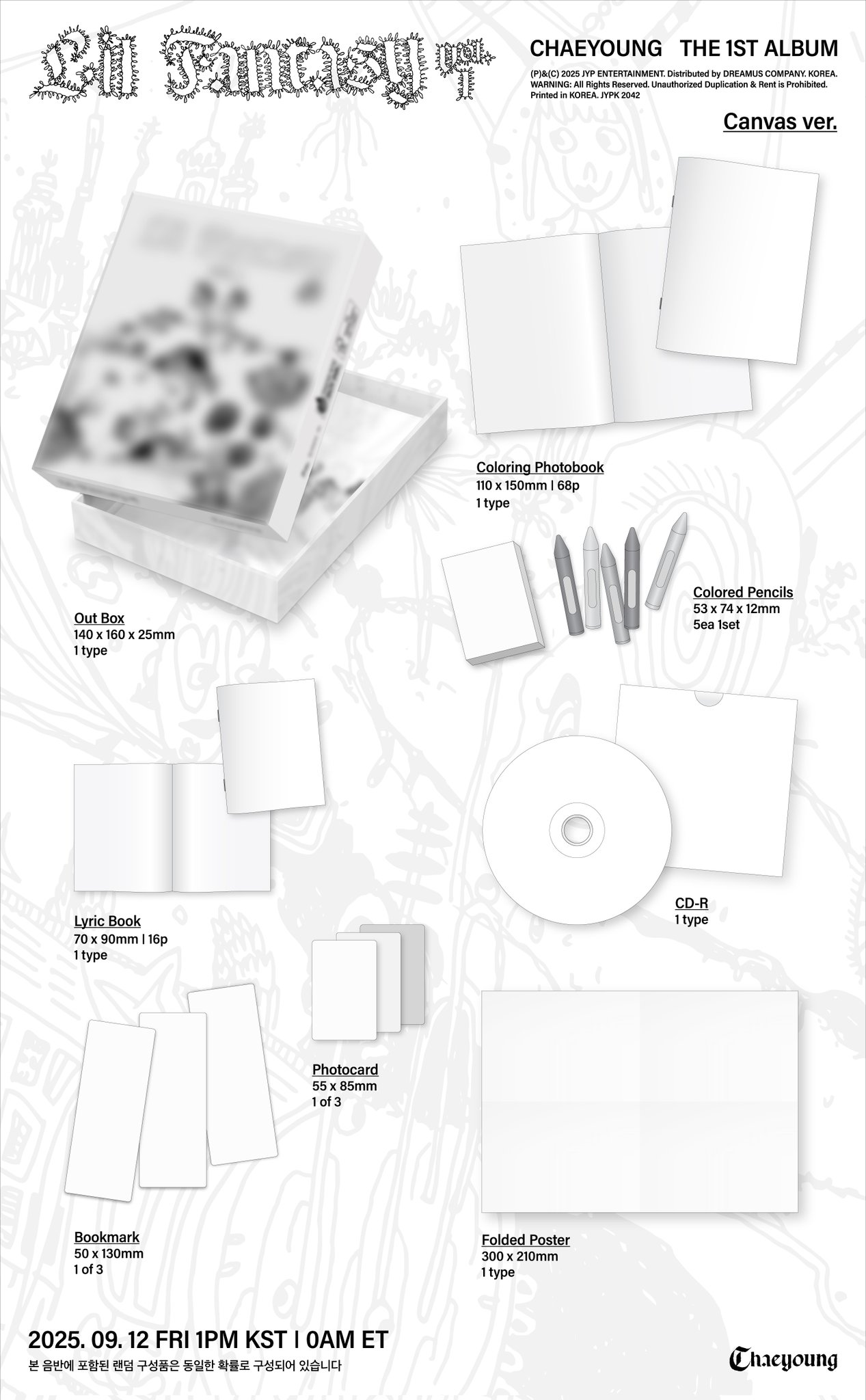 - Contiene: Out Box, CD, Coloring Photobook: 68p, 5 Colored Pencils, Lyric Book: 16p, 1 Photocard random, 1 Bookmark random, Folded Poster