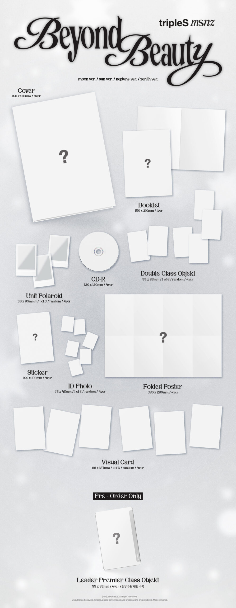- SET 4 versión, cada una contiene: Cover, CD, Booklet, 1 Double Class Objekt random, 1 Unit Polaroid random, Sticker, 1 ID Photo random, Folded Poster, 1 Visual Card random