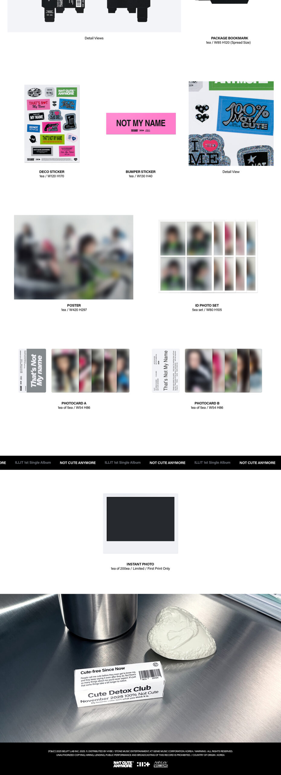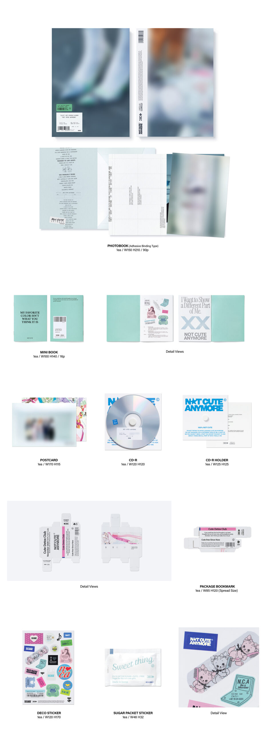 - NOT CUTE Ver.: Clear Pouch, Clear Pouch Inner Sheet, Product Information Insert, CD, Photobook: 90p, Mini Book: 16p, Postcard, Package Bookmark, Sticker (Deco, Sugar Packet), 1 Photocard A random, 1 Photocard B random