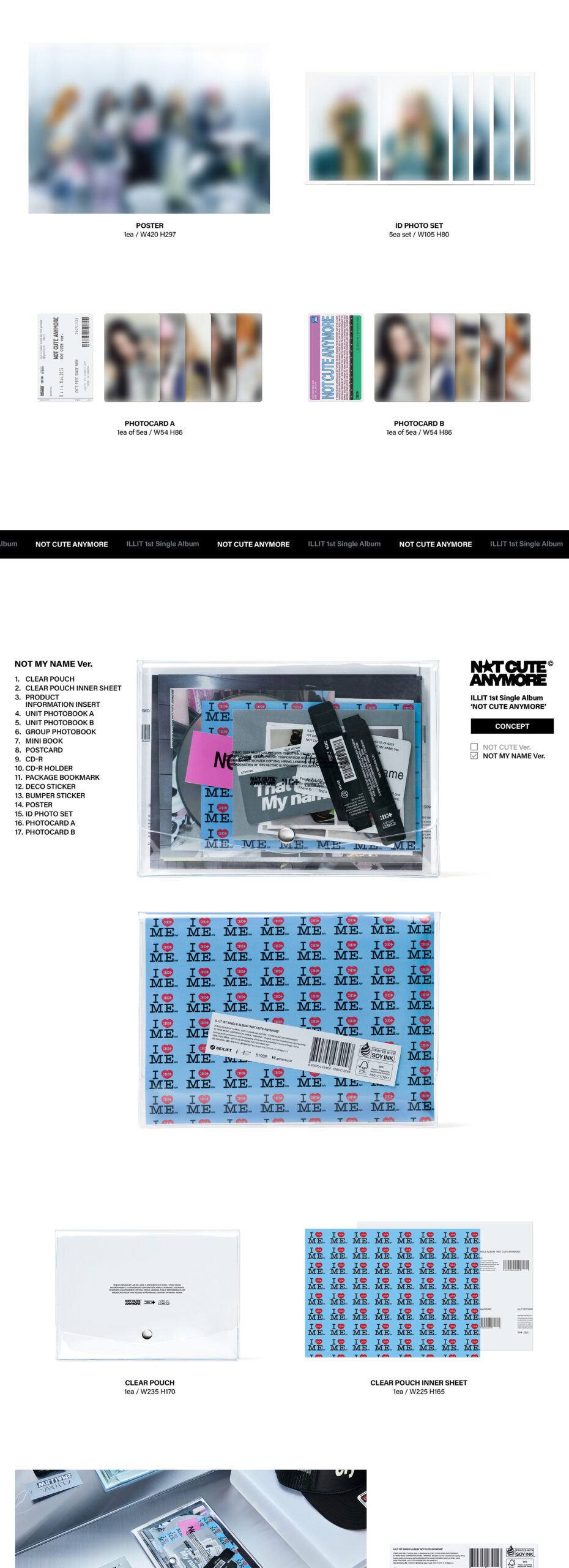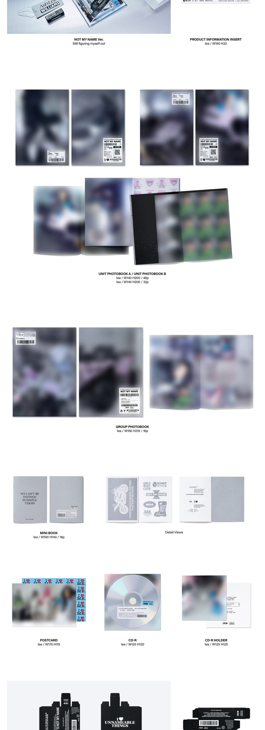 - NOT MY NAME Ver.: Clear Pouch, Clear Pouch Inner Sheet, Product Information Insert, CD, Unit Photobook A: 48p, Unit Photobook B: 32p, Group Photobook: 16p, Mini Book: 16p, Postcard, Package Bookmark, Sticker (Deco, Bumper), Poster, 5 ID Photo, 1 Photocard A random, 1 Photocard B random
