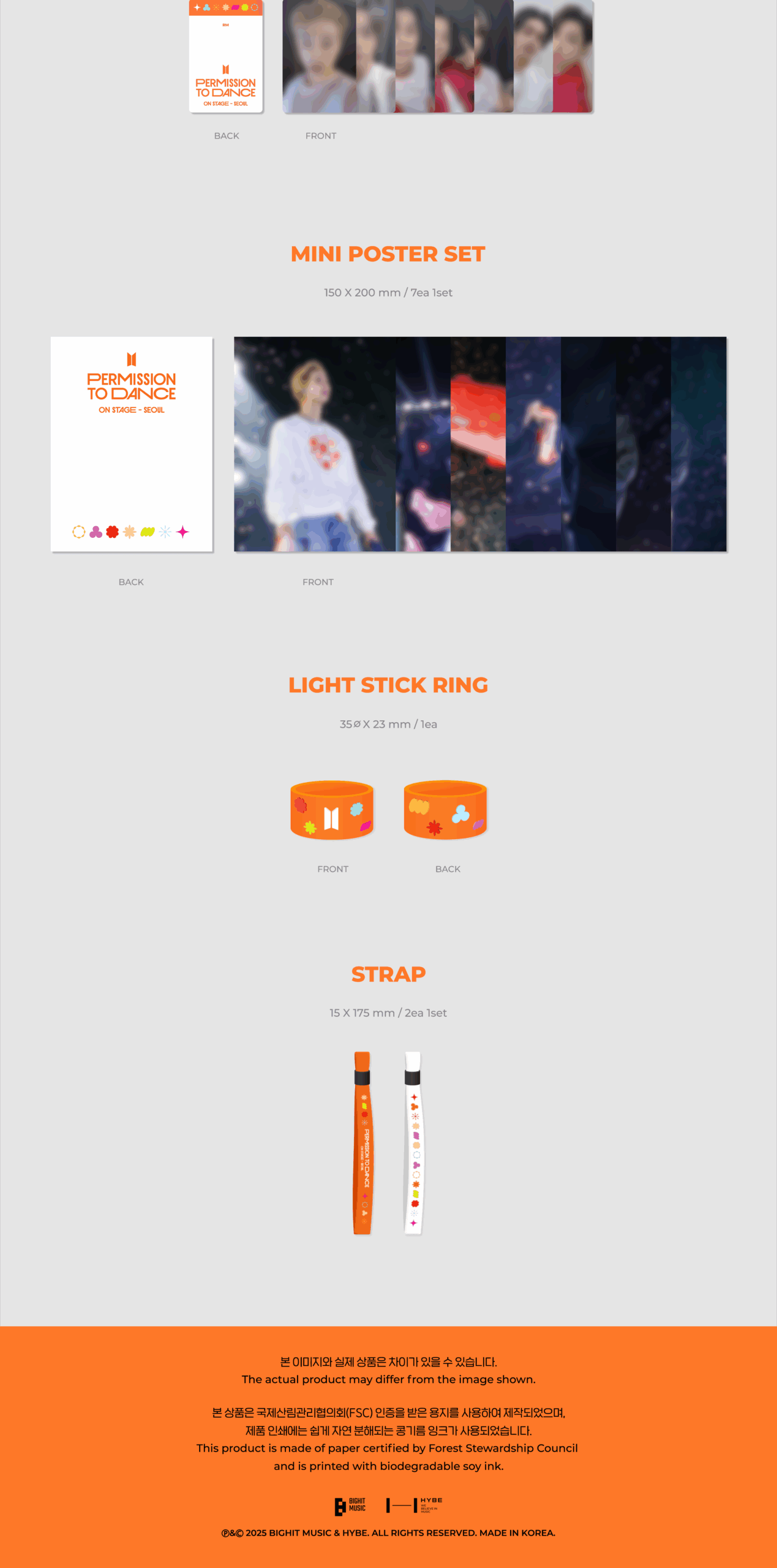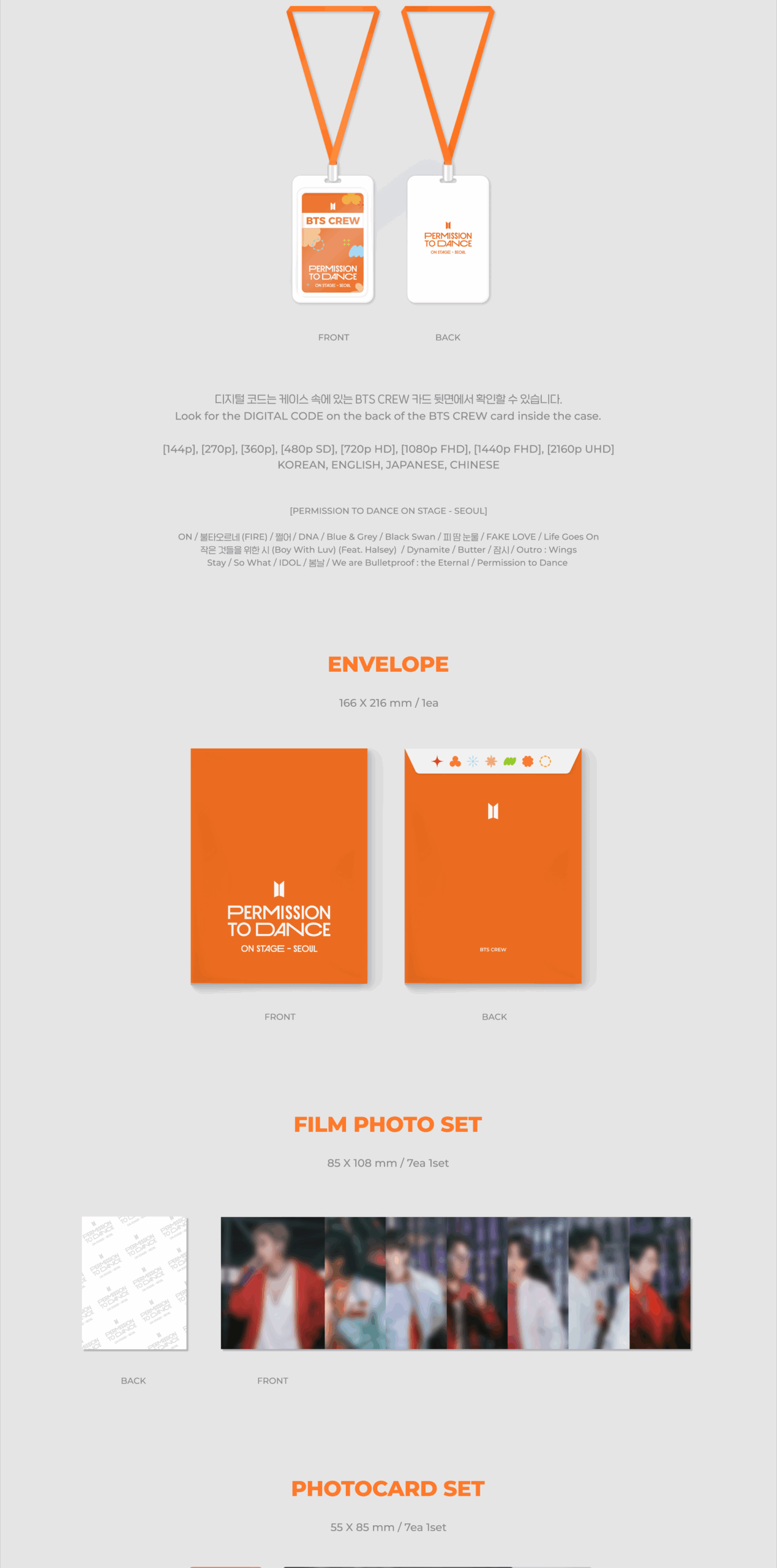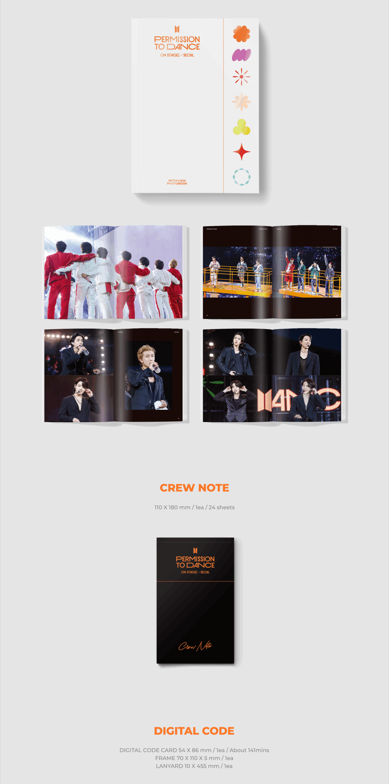 - Contiene: Out Cover: 325x250mm, Interview Photobook: 92p, Crew Note: 24p, Digital Code, Envelope, Film Photo Set, Photocard Set, Mini Poster Set, Light Stick Ring, Strap
