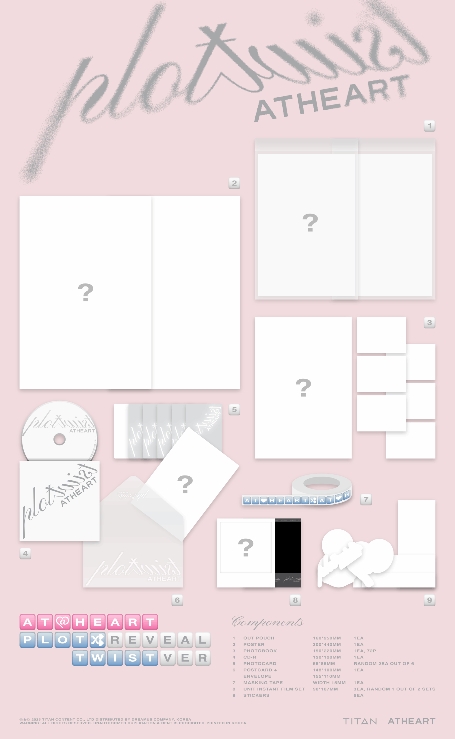 - Contiene: Out Pouch: 160x250mm, CD, Photobook: 72p, Poster, 2 Photocard random, Postcard / Envelope, Masking Tape, 1 Unit Instant Film Set random, 6 Sticker