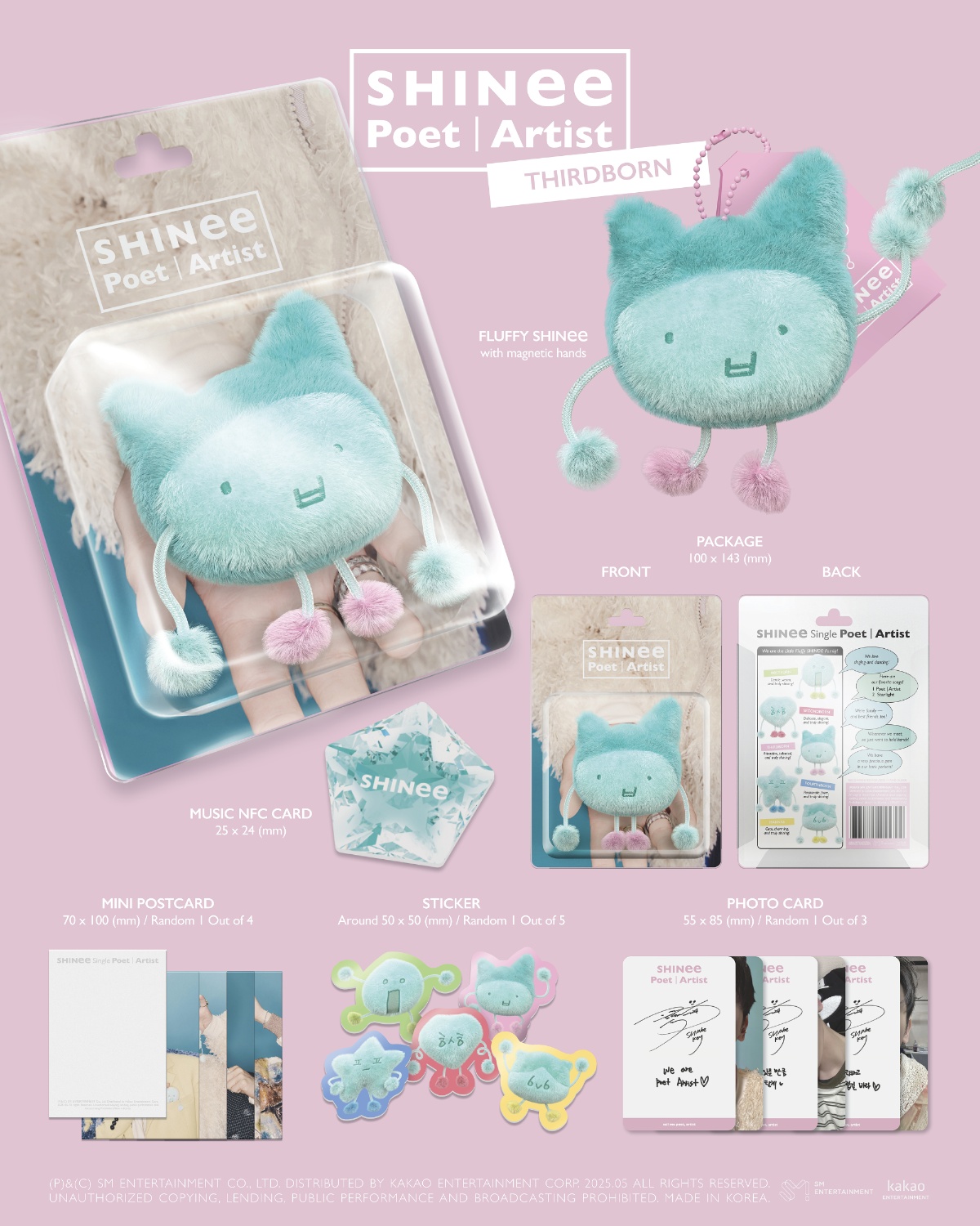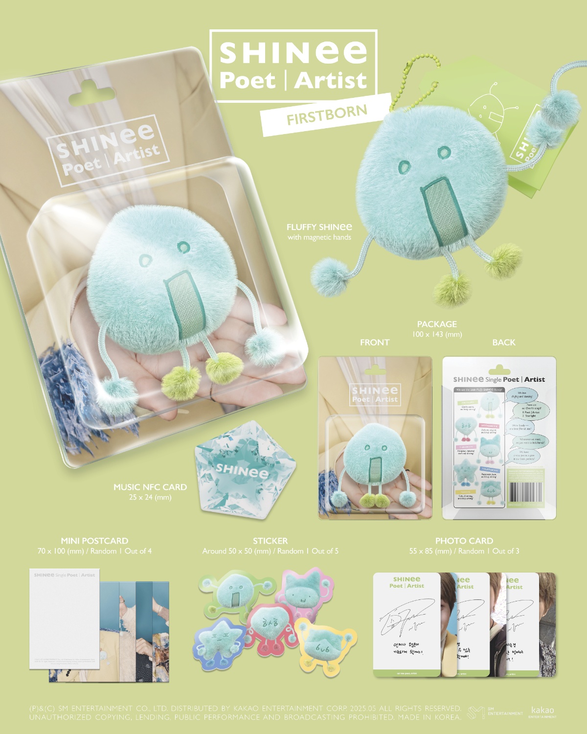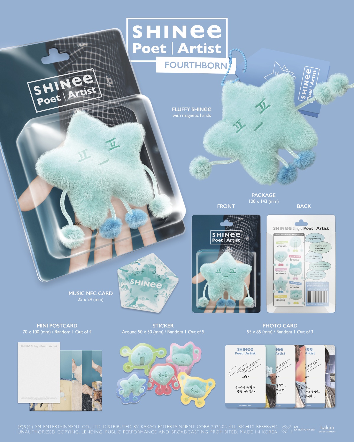 - Contiene: Package: 100x143mm, Fluffy SHINee, Music NFC Card, 1 Mini Postcard random, 1 Sticker random, 1 Photocard random