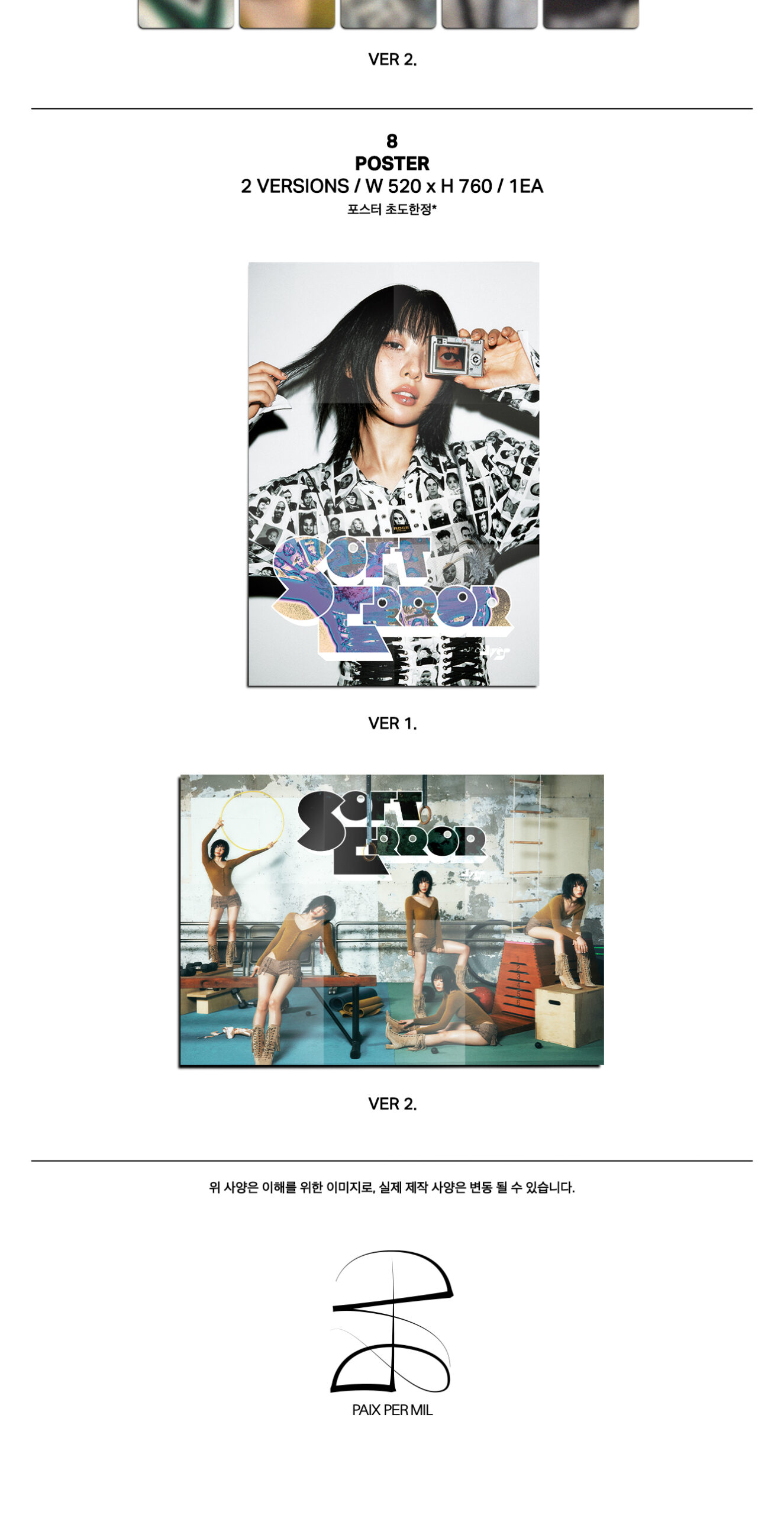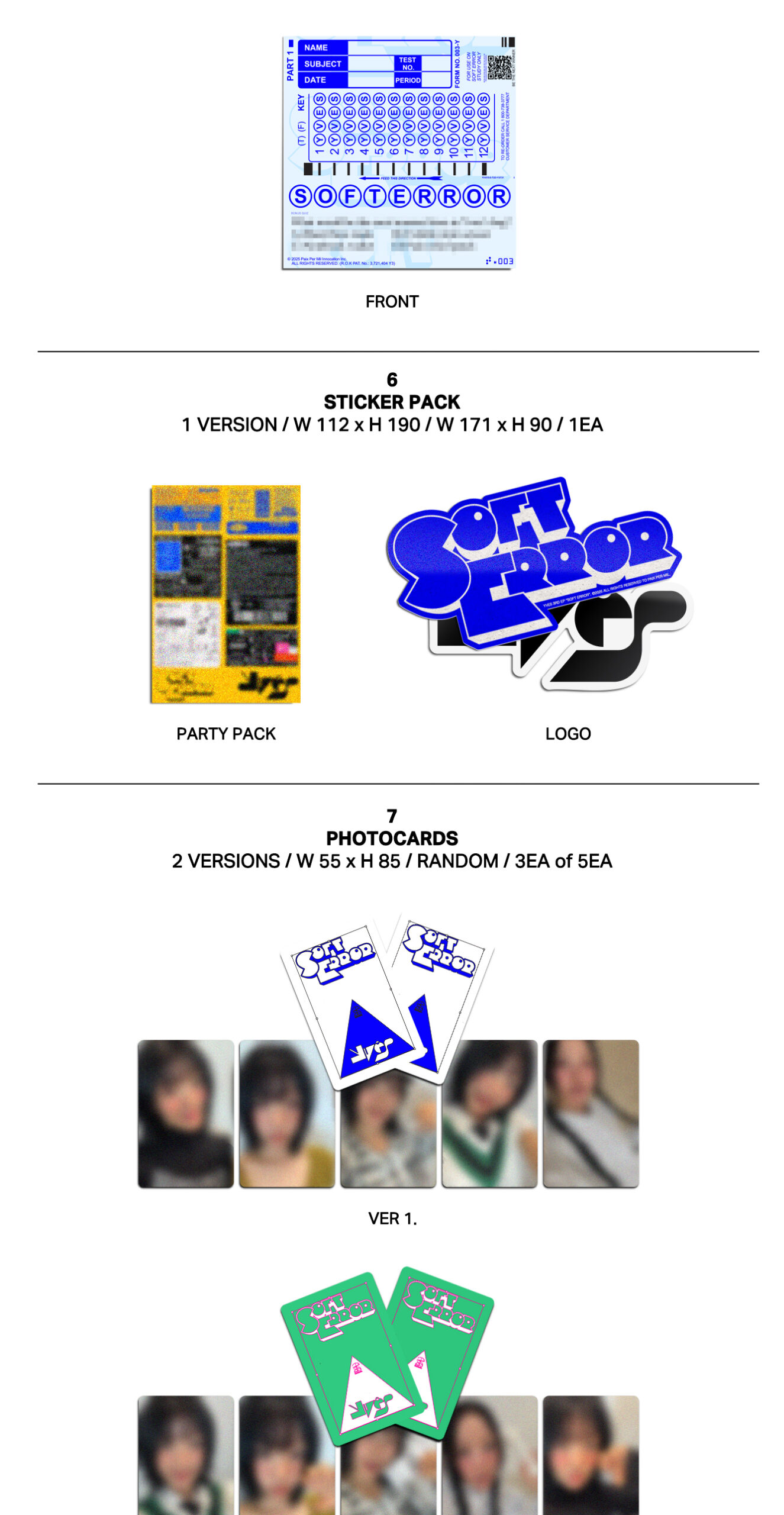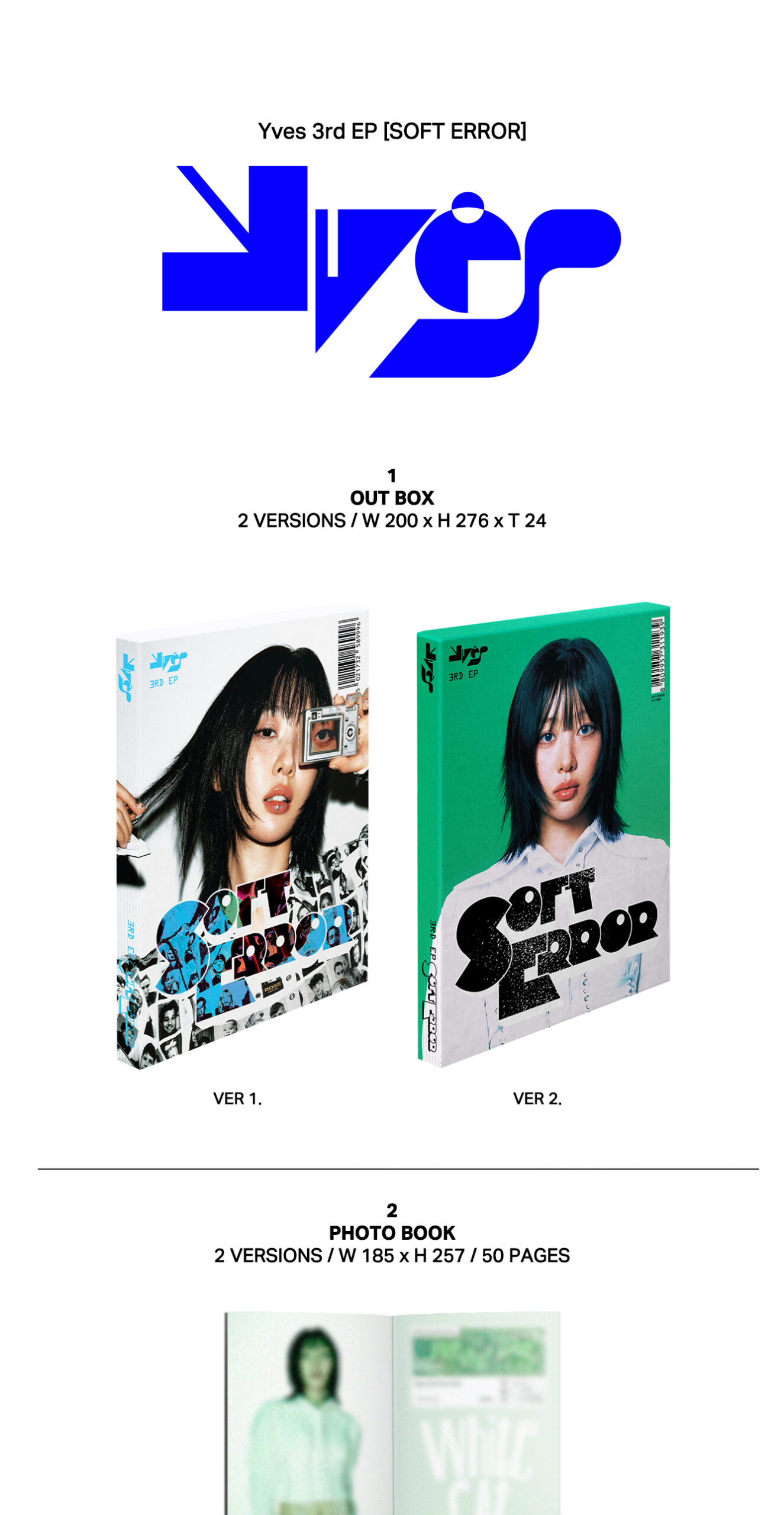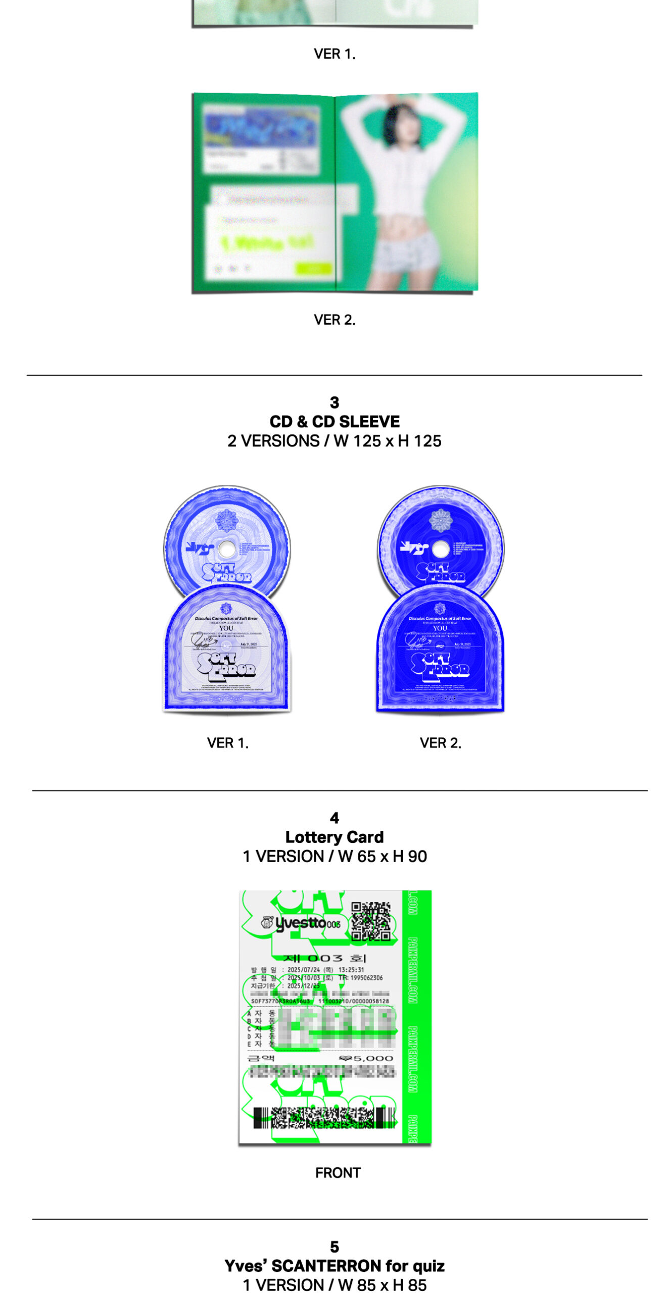- SET 2 versiones, cada una contiene: Out Box, CD / Sleeve, Photobook: 50p, Lottery Card, Yves’s Scanterron for quiz, Sticker Pack, 3 Photocard random