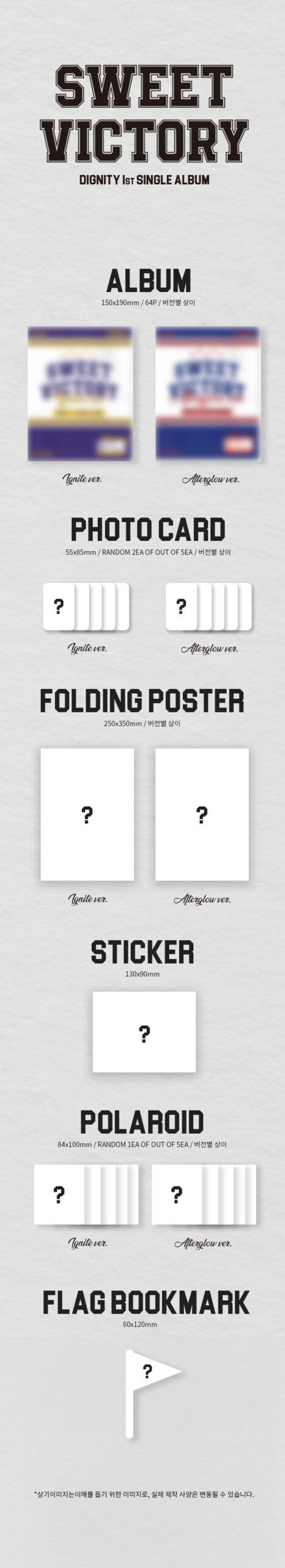 - SET 2 versiones, cada una contiene: CD, Photobook: 64p, 2 Photocard random, Folding Poster, Sticker, 1 Polaroid random, Flag Bookmark