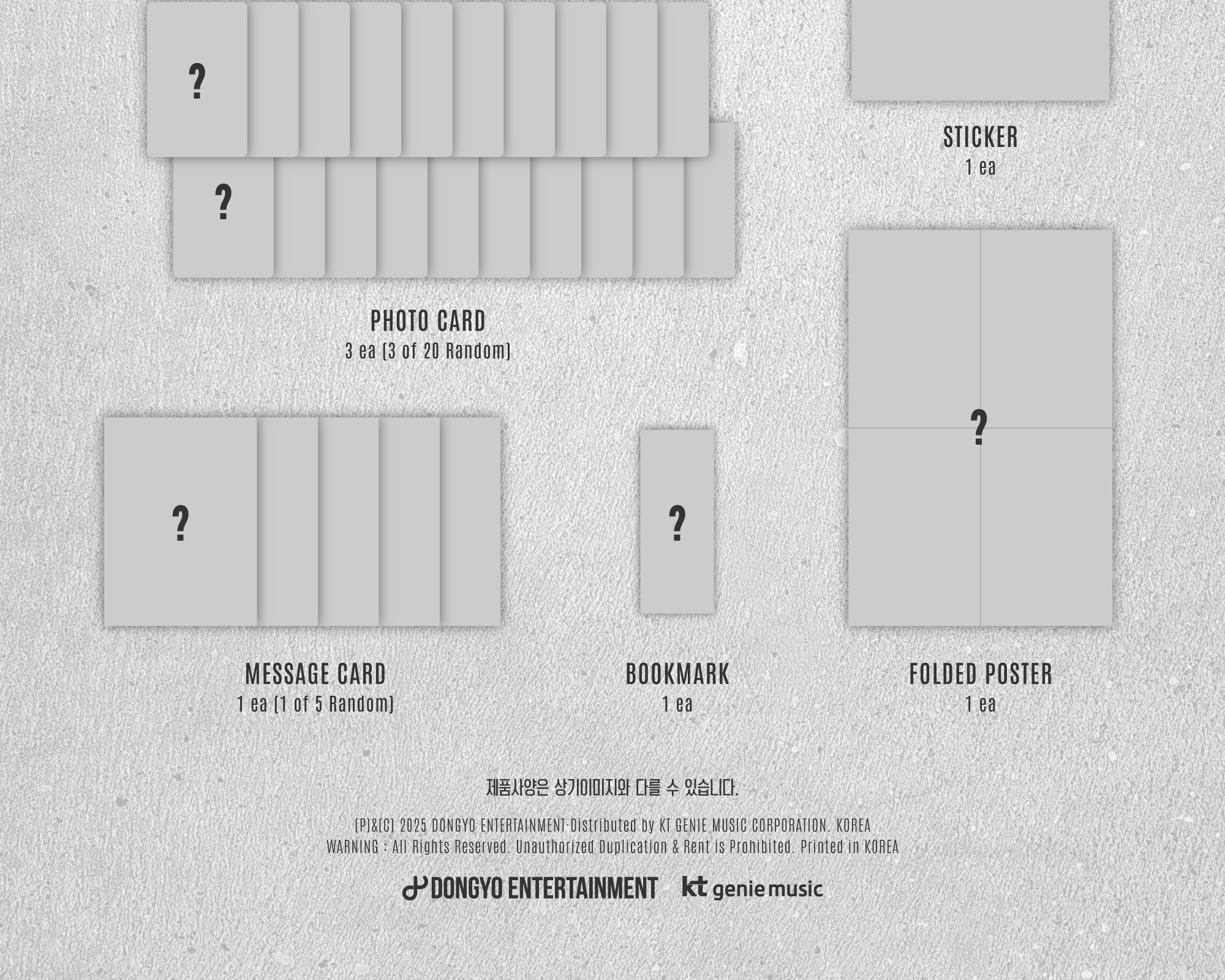 - Contiene: CD, Photobook: 64p, 3 Photocard random, Sticker, Bookmark, 1 Message Card random, Folded Poster