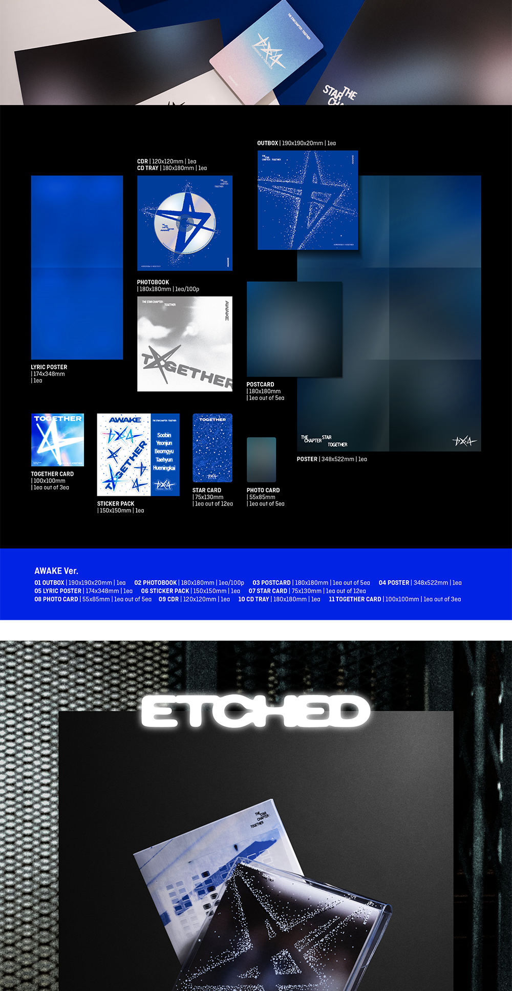 - Versión AWAKE: Outbox: 190x190mm, CD, Photobook: 100p, 1 Postcard random, Poster, Sticker Pack, 1 Star Card random, 1 Photocard random, 1 Together Card random