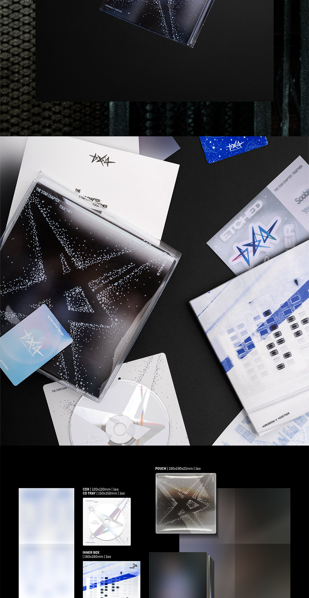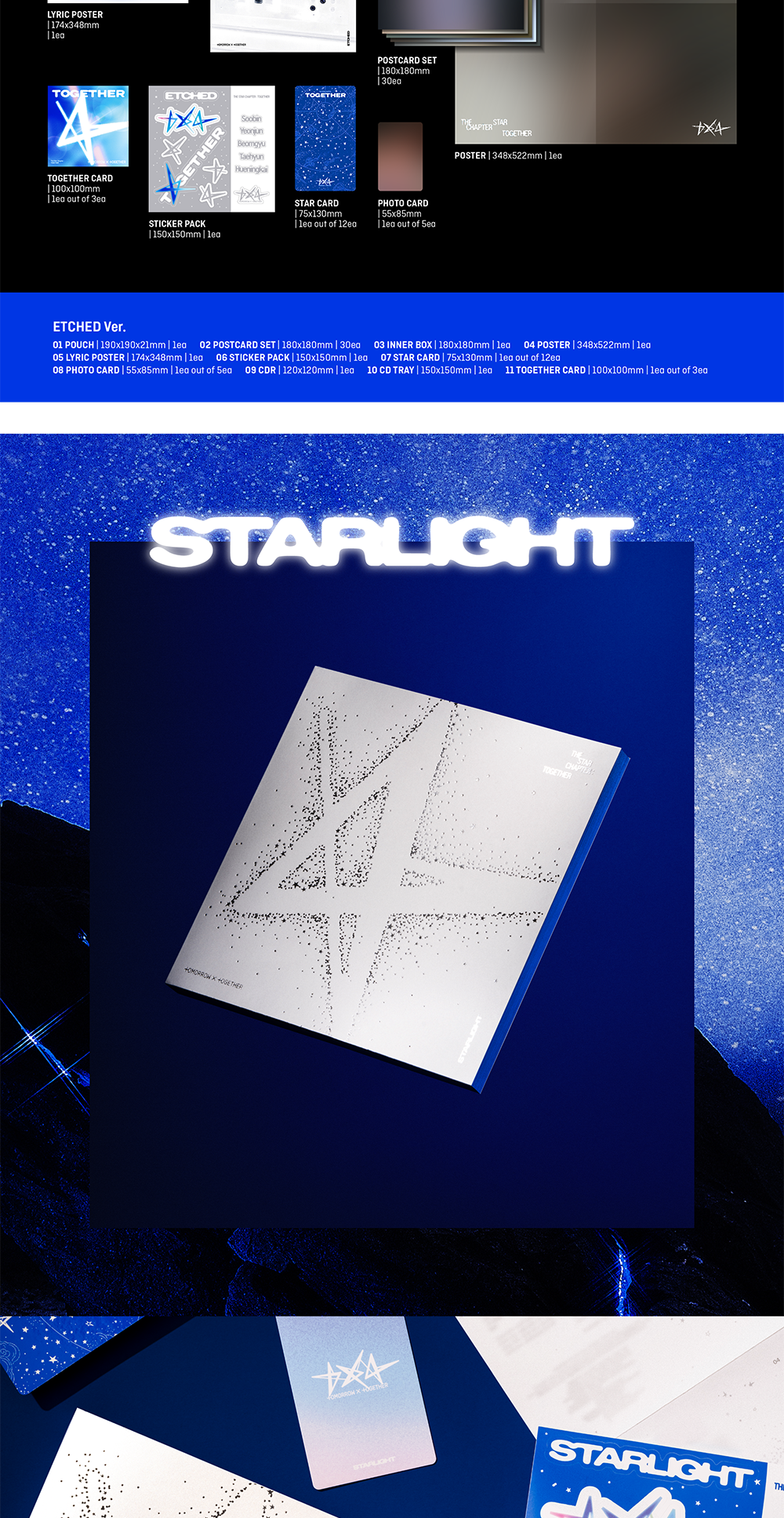 - Versión ETCHED: Pouch: 190x190mm, CD, Postcard: 30p, Inner Box, Poster, Sticker Pack, 1 Star Card random, 1 Photocard random, 1 Together Card random