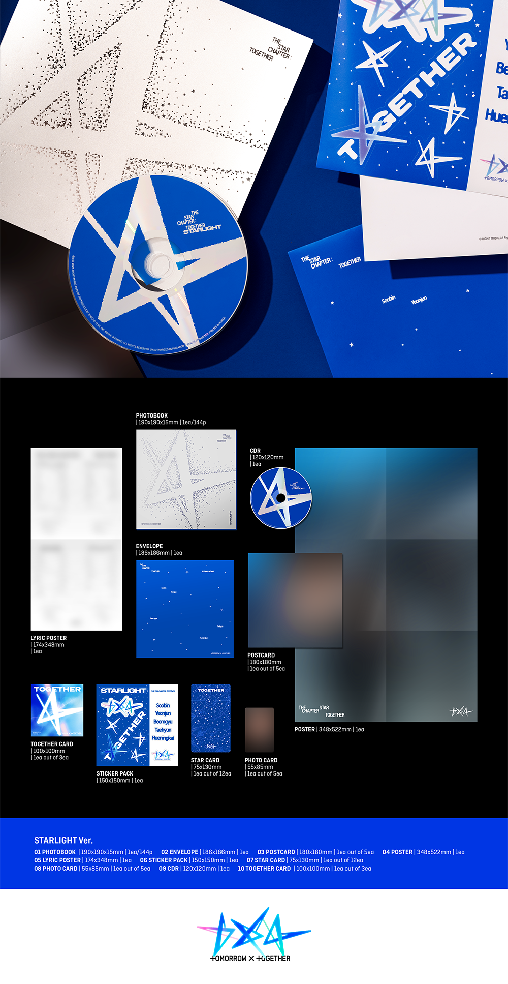 - Versión STARLIGHT:CD, Photobook: 144p, 1 Postcard random, Poster, Sticker Pack, 1 Star Card random, 1 Photocard random, 1 Together Card random