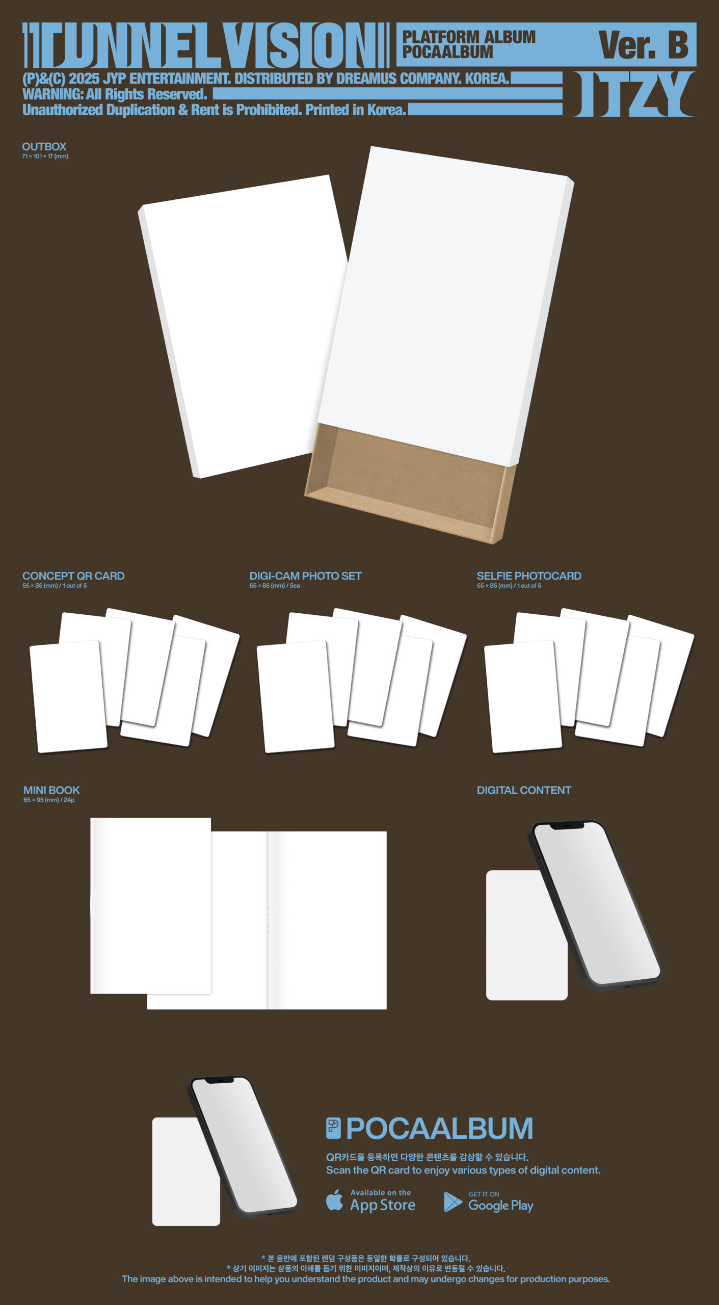 • Contiene: Outbox, 1 Concept QR Card random, 5 Digi-Cam Photo, 1 Selfie Photocard random, Mini Book: 24p