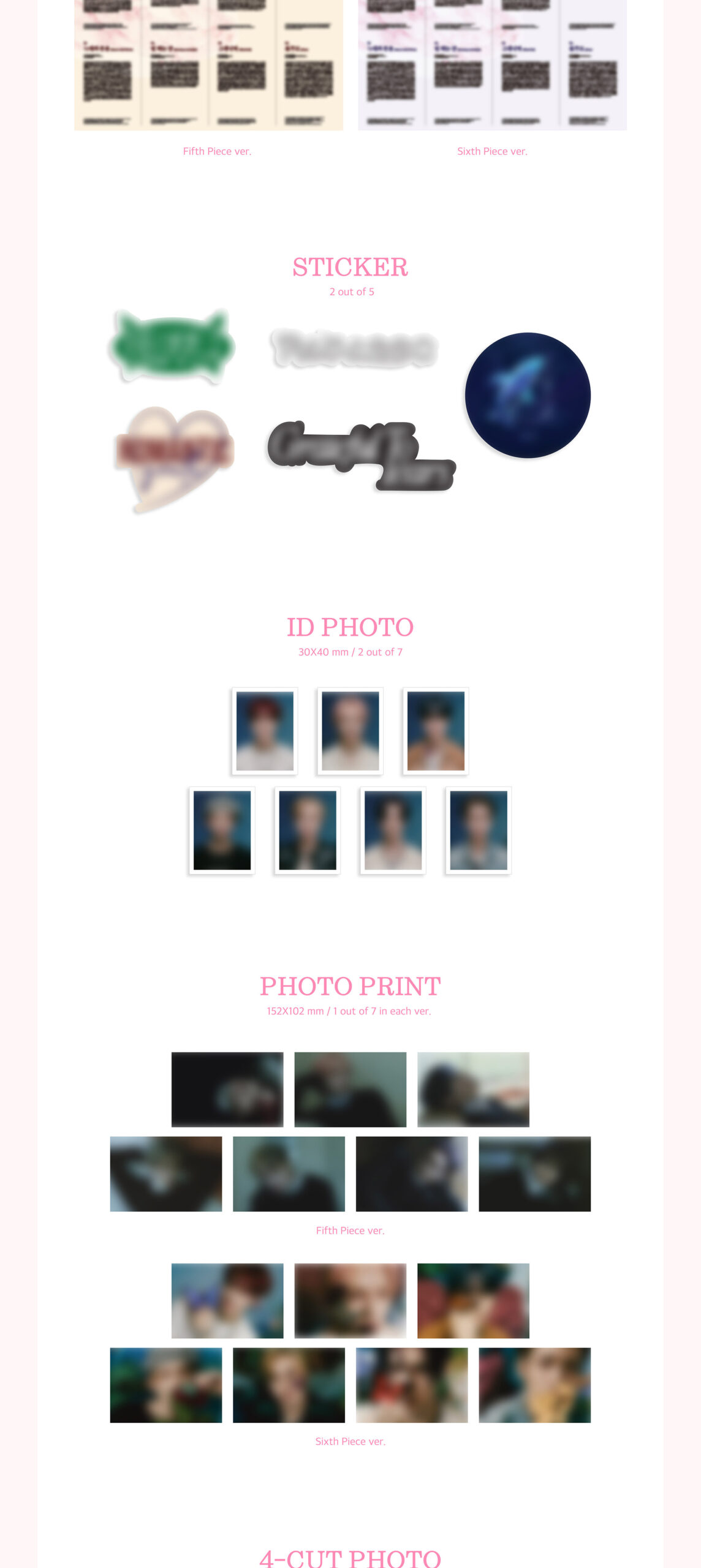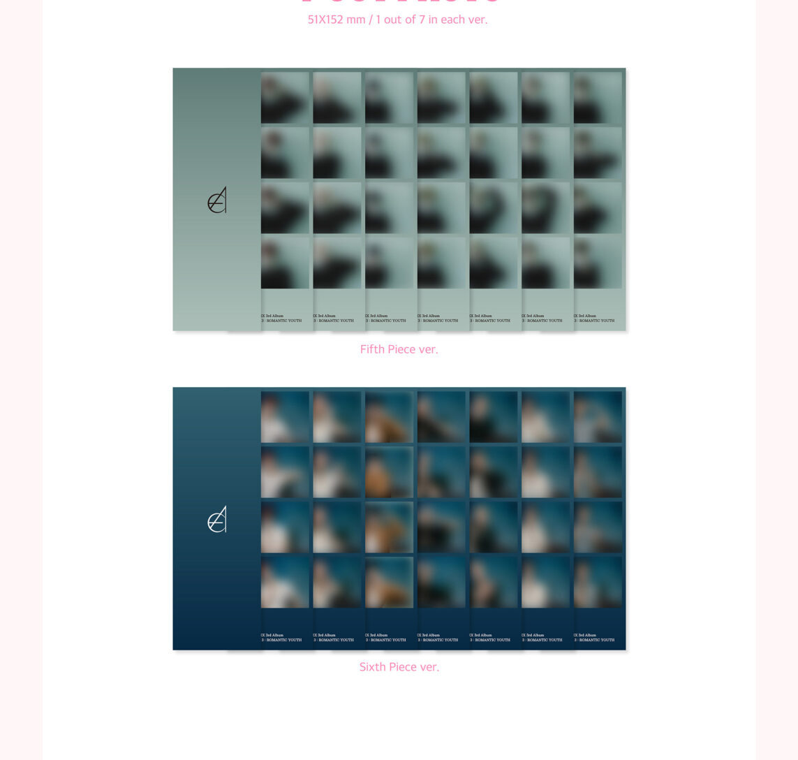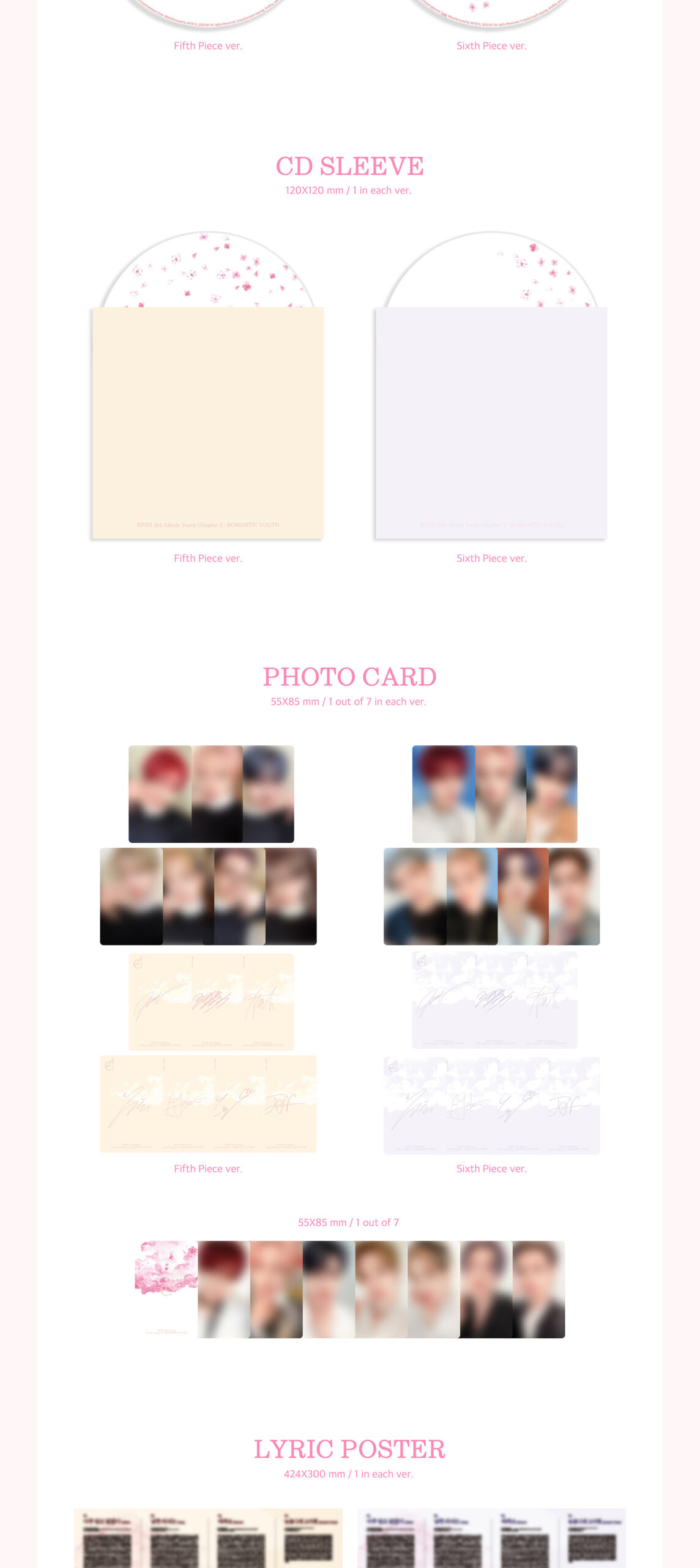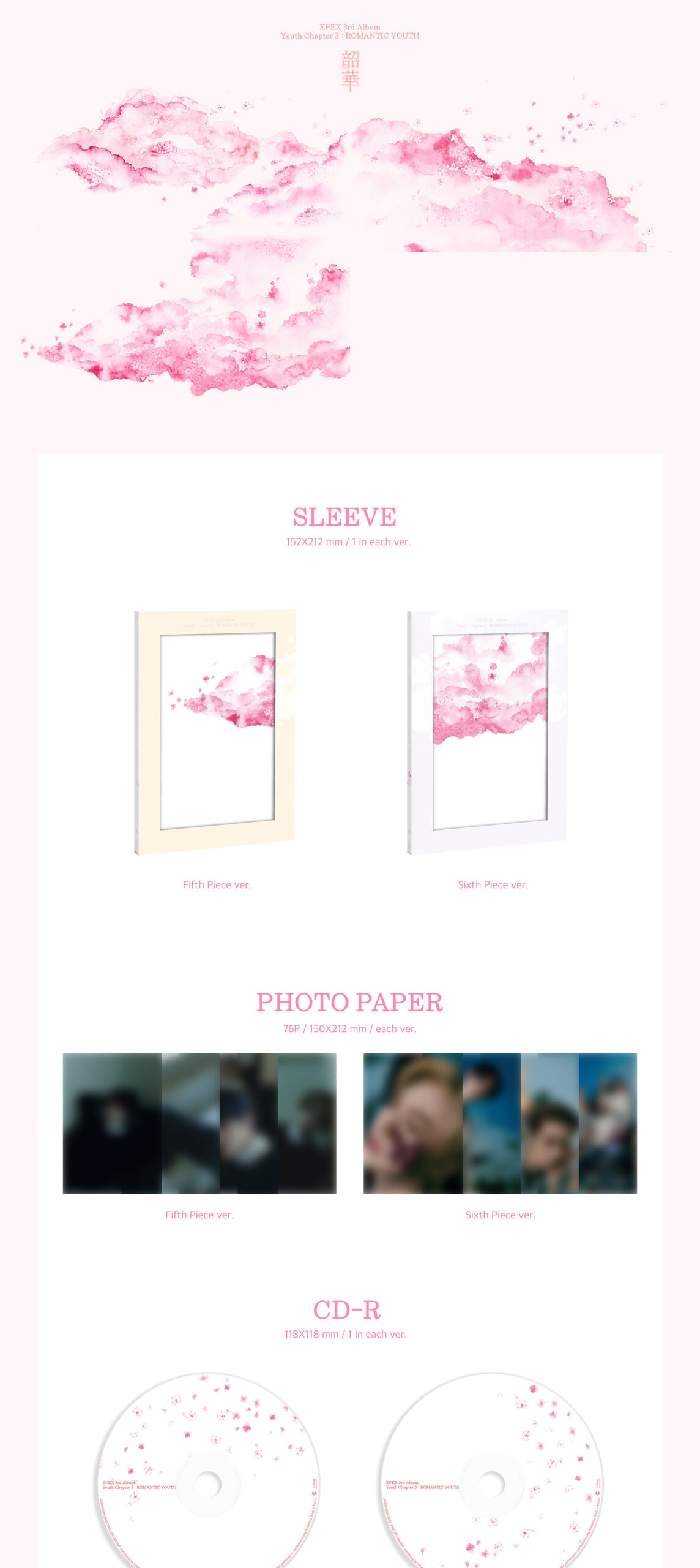 - SET 2 versiones, cada una contiene: Sleeve: 152x212mm, CD, Photo Paper: 76p, 1 Photocard random, Lyric Poster, 2 Sticker random, 2 ID Photo random, 1 Photo Print random, 1 4-Cut Photo random